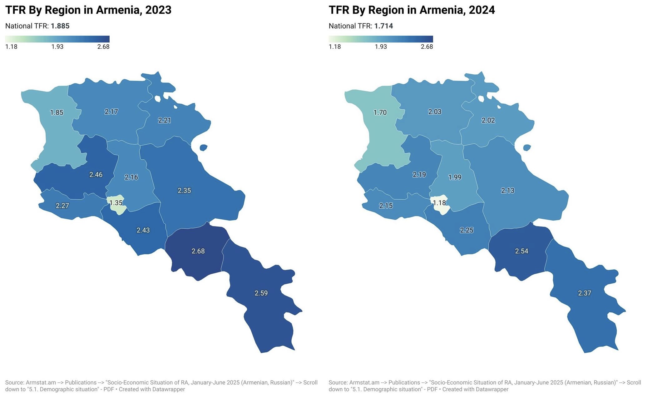2021–2024 թվականների տվյալներով՝ Հայաստանի մարզերում ծնելիության մակարդակը սովորաբար աճող տենդենց է ցուցաբերում, մինչդեռ մայրաքաղաք Երևանում այն աստիճանաբար նվազել է։ Մասնագետների կարծիքով՝ բնակչության բնական համալրման համար միջինը պետք է կազմի 2 երեխա մեկ կնոջ հաշվով, ինչը հնարավորություն է տալիս պահպանել բնակչության կայունությունը։