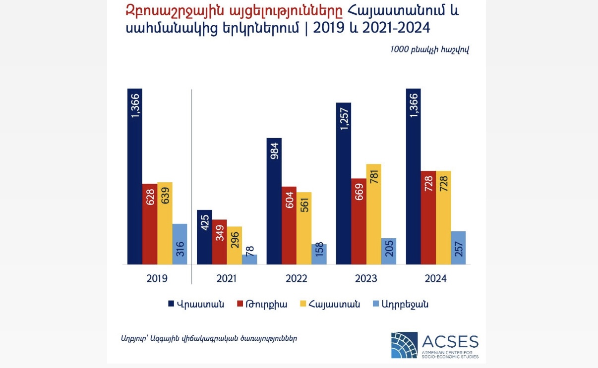 ✅ Սակայն, երբ դիտարկում ենք զբոսաշրջային այցելությունների քանակը 1,000 բնակչի հաշվով, պատկերը փոխվում է։ 2024 թվականին 1,000 բնակչի հաշվով ամենաշատ զբոսաշրջային այցելությունները դիտվել են Վրաստանում (1,366 այցելություն), որին հաջորդում են Հայաստանն (727.9), Թուրքիան (727.7) և Ադրբեջանը (257)։